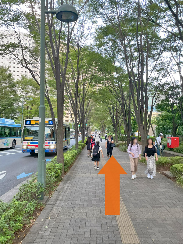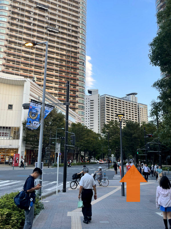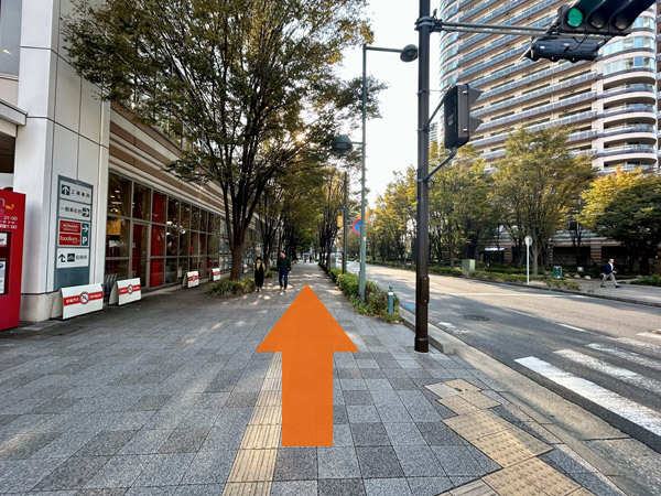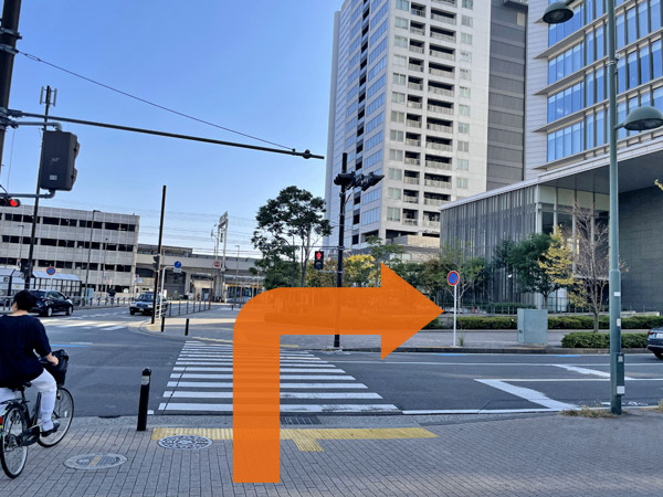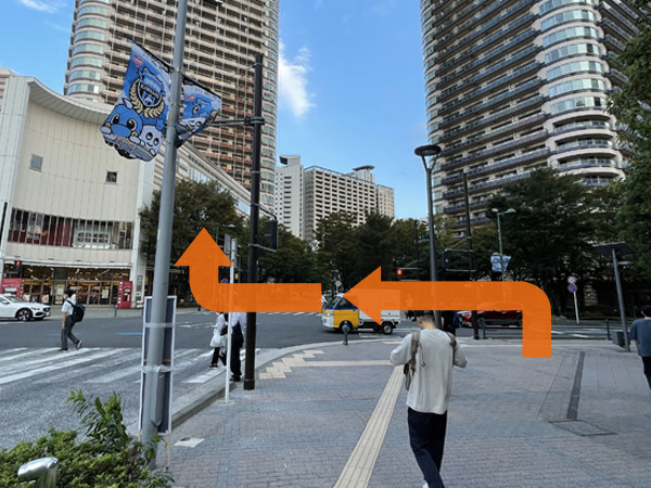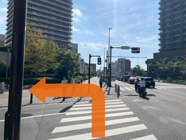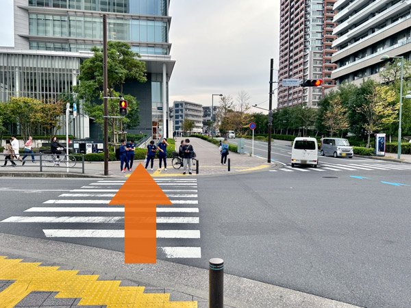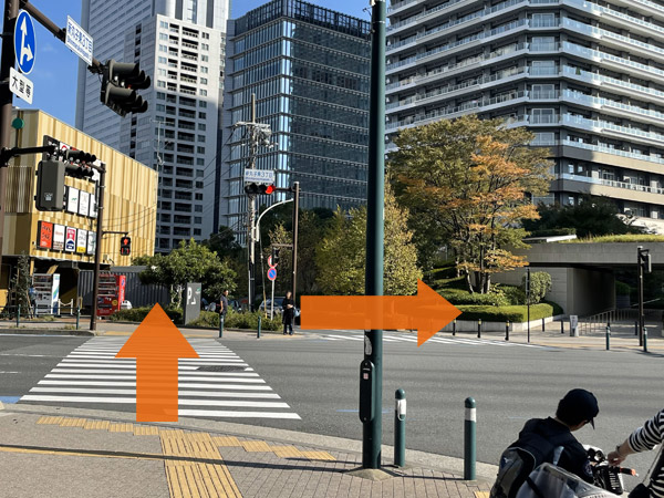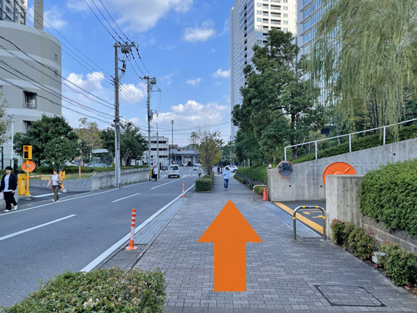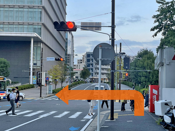 ・新丸子東三丁目交差点の横断歩道を渡ったのちに右折し再度横断歩道を渡ってください。