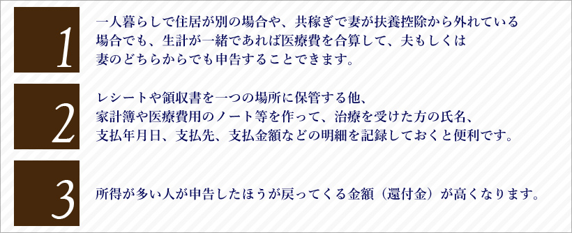 一人暮らしで住居が別の場合や、共稼ぎで妻が扶養控除から外れている場合でも、生計が一緒であれば医療費を合算して、夫もしくは妻のどちらからでも申告することできます。