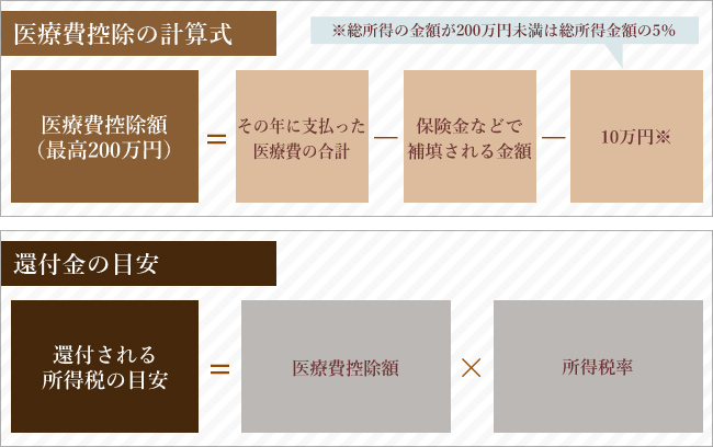 医療費控除とは、ご自分やご家族の皆様を対象に、1月1日~12月31日の1年間に10万円以上、または所得が200万円以下で所得の5%以上の医療費を支払った場合、一定の金額の所得控除を受けることができる制度です。