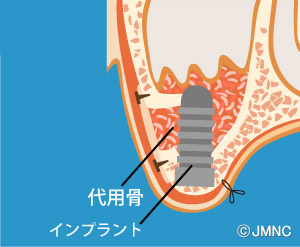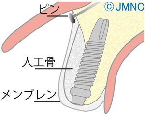 | 術式・特徴 | 抜歯後、骨が痩せてしまい、インプラントを埋入するための骨の幅が足りない場合に用います。 頬の側の骨に骨補填剤を填入し、メンブレンと呼ばれる膜で覆うことにより骨を造成します。 |